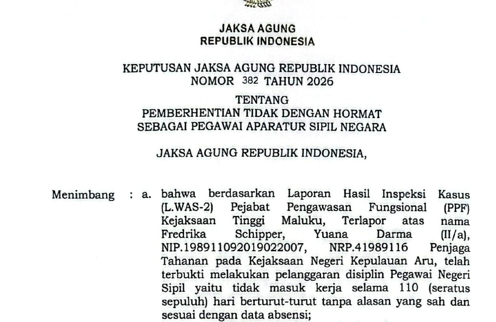 RT.COM, Kejaksaan Tinggi (Kejati) Maluku, melalui Bidang Pengawasan yang dipimpin langsung oleh Asisten Pengawasan, Bobby Ruswin, S.H.,M.H, pada Kamis (23/4/2026), resmi menyerahkan Surat Keputusan (SK) Pemberhentian Dengan Tidak Hormat (PTDH) kepada Sdri. “FS” yang berstatus sebagai Pegawai Tata Usaha pada Kejaksaan Negeri Kepulauan Aru.