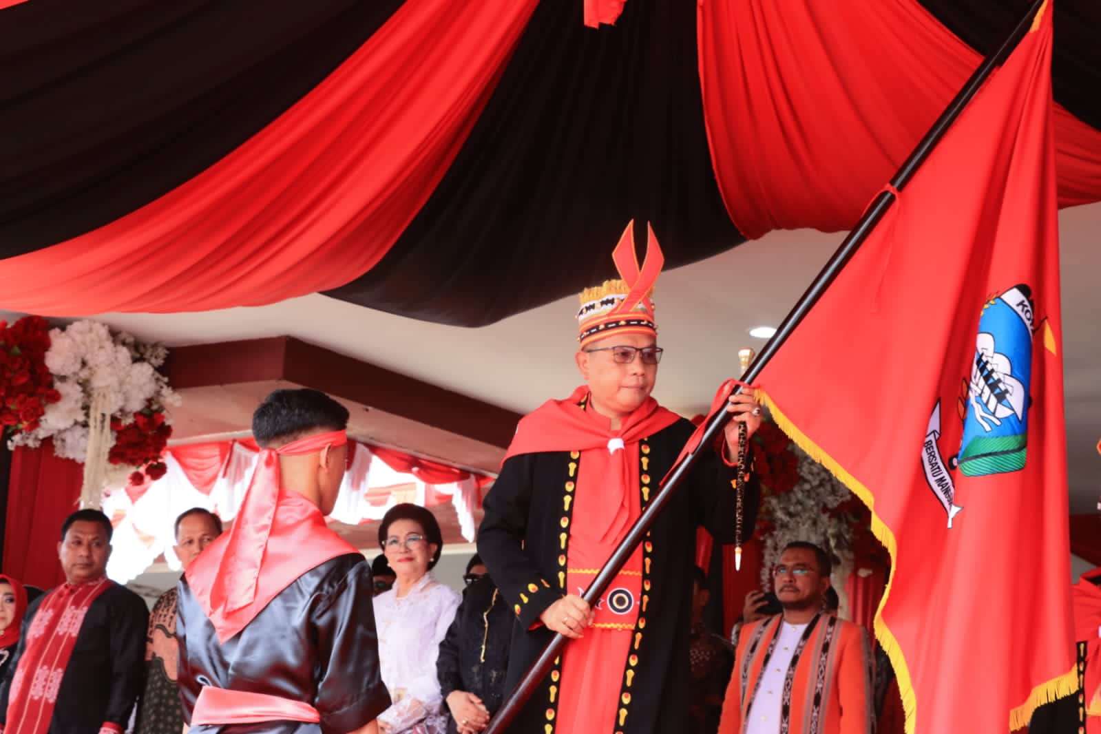 Acara Hut diteruskan dengan Prosesi penyerahan bendera kota Ambon oleh upu latu kota Ambon.